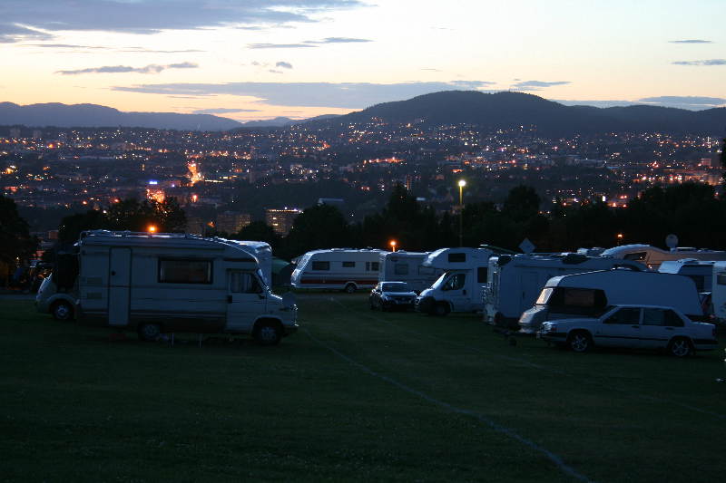 Wir spazierten also vom Hauptbahnhof kommend die Karl Johann Gata bis zum königlichen Schloss, machen noch einen kurzen Rundgang durch den Schlossgarten, schauten uns von außen das Rathaus und das Nationaltheater an und gingen dann langsam wieder zurück zum Bahnhof, wo wir gegen 22.30 Uhr wieder den Bus bestiegen. Anschließend genossen wir noch von unserem Wohnmobil den schönen Ausblick auf das abendliche Oslo. Die unten stehende Aufnahme wurde etwa um 0.15 gemacht und man sieht deutlich, dass die Nacht in Oslo um diese Jahreszeit noch immer nicht wirklich dunkel ist.