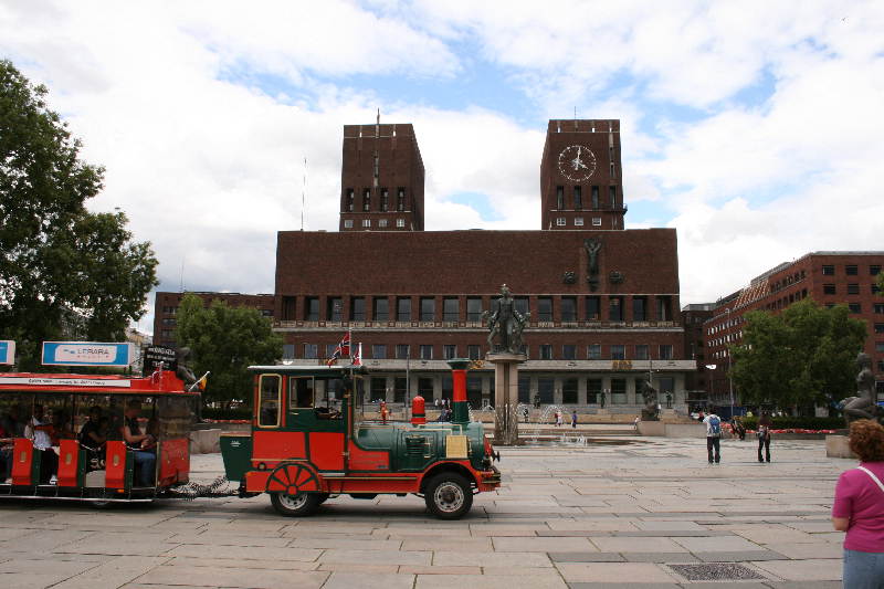 Rund um die Festung, die sich wie eine Zunge in den Oslofjord erstreckt, legen die großen Kreuzfahrt- und Fährschiffe an. An der Pipervika, der anderen großen Bucht, liegt das in den Jahren 1931 bis 1950 nach Plänen von Arnstein Arneberg und Magnus Poulson erbaute Rathaus der Stadt, ein wirklich hässlicher Backsteinbau mit zwei Türmen, an dem das Glockenspiel, das zur vollen Stunde ertönt, ein kleiner Lichtblick ist.