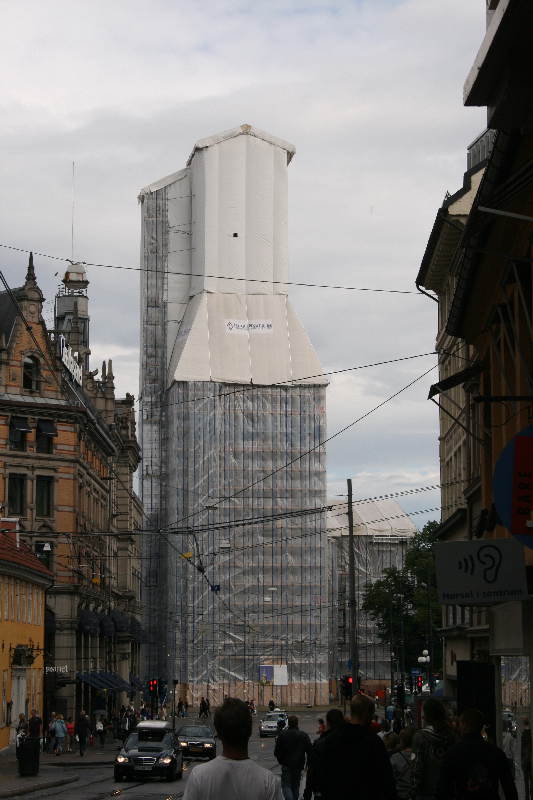 An der Sentralstatjon (Hauptbahnhof) verließen wir den Bus und statteten als erstes der neuen Osloer Oper an der Bjorvika, einer Bucht am Oslofjord, einen Besuch ab. Die Oper ist vollkommen neu und wurde erst im April 2008 eröffnet. Der Entwurf stammt von dem norwegischen Architekturbüro Snohetta und wetteifert im Aussehen direkt mit dem Opernhaus in Sydney. Es ist denkbar, das der Neubau dann, wenn Baustellen die in seiner unmittelbaren Umgebung verschwunden sind, ähnlich die Skyline der Stadt von der Hafenseite her bestimmen wird, wie die Oper in der australischen Metropole. Was mir besonders gut gefällt, ist, dass man das Gebäude vom Wasserniveau aus auf seinen schräg ansteigenden Flächen bis das Dach begehen kann. Von dort oben aus hat man dann zukünftig sicher einen herrlichen Ausblick über den Hafen bis weit hinein in den Oslofjord mit seinen der Stadt vorgelagerten Inseln.