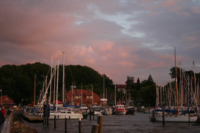 Gegen 20 Uhr erreichten wir dann Langballigau an der Flensburger Förde. Im Restaurant Fährhaus aß Inge eine Norwegische Lachsplatte und ich einen Fischteller. Beide Gerichte waren sehr lecker. Dazu tranken wir ein frisch gezapftes Bier. Bei Bezahlen stellten wir dann fest, wie preisgünstig wir in Deutschland leben können. Wir erlebten noch einen herrlichen Sonnenuntergang über der Förde.