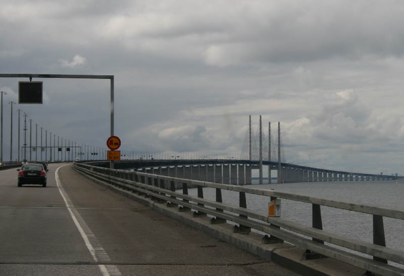 Wir gingen dann an den Kanälen entlang wieder zu unserem Wohnmobil zurück. Kurz vor 3 Uhr setzen wir unsere Reise in Richtung Süden fort. Kurz hinter Malmö erreichten wir die im Jahre 2000 fertig gestellte 7845 m lange Öresundbrücke, deren Kernstück die 1092 m lange Hochbrücke ist. Im Westen schließt sich dann noch ein 4 km langer Unterwassertunnel an. Die Maut betrug 650 SEK. Leider gibt es an der E20 keinen Parkplatz, von dem aus man das imposante Bauwerk hätte in Ruhe betrachten und fotografieren können.