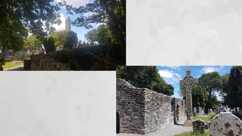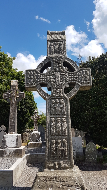 Zur vergangenen Nacht kann man nur sagen: es hat geregnet! Laut Wetterbericht bestand eine gewisse Chance auf besseres Wetter, Als wir gegen 11 Uhr starteten, wir hatten ja für heute keine weite Strecke eingeplant, regnete es zwar nicht mehr so heftig, aber der Nieselregen nahm uns je Sicht. So kam es, dass wir von der angeblich sehr schönen Strecke unmittelbar entlang des Ufers nicht viel zu sehen bekamen. Stehenbleiben war keine Option; denn wir wussten ja nicht, ob und wann der Regen aufhört. Also sind wir langsam weiter nach Süden gerollt. Am frühen Nachmittag erreichten wir die Ruinen der Klosteranlage Monasterboice. Das Kloster wurde im frühen 6. Jahrhundert gegründet und nach einem Brand im Jahre 1097 aufgegeben. Der Friedhof aber wird, wie in Irland üblich, bis heute weiter genutzt. Von der ursprünglichen Anlage sind der Rundturm, zwei Kirchenruinen und die aus dem 9. Jahrhundert stammenden Hochkreuze. Das Muiredachkreuz ist 5,2 m hoch. Ornamente und Darstellungen aus dem Alten und Neuen Testament sind überraschen gut erhalten. Mit 6,5 m ist das Westkreuz noch einmal über einen Meter höher und zeigt ebenfalls Darstellungen aus der Bibel.